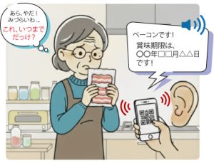 賞味期限・商品名・アレルギー情報など、パッケージ上の文字情報を〝音声〟で聞くことができる仕組みです。